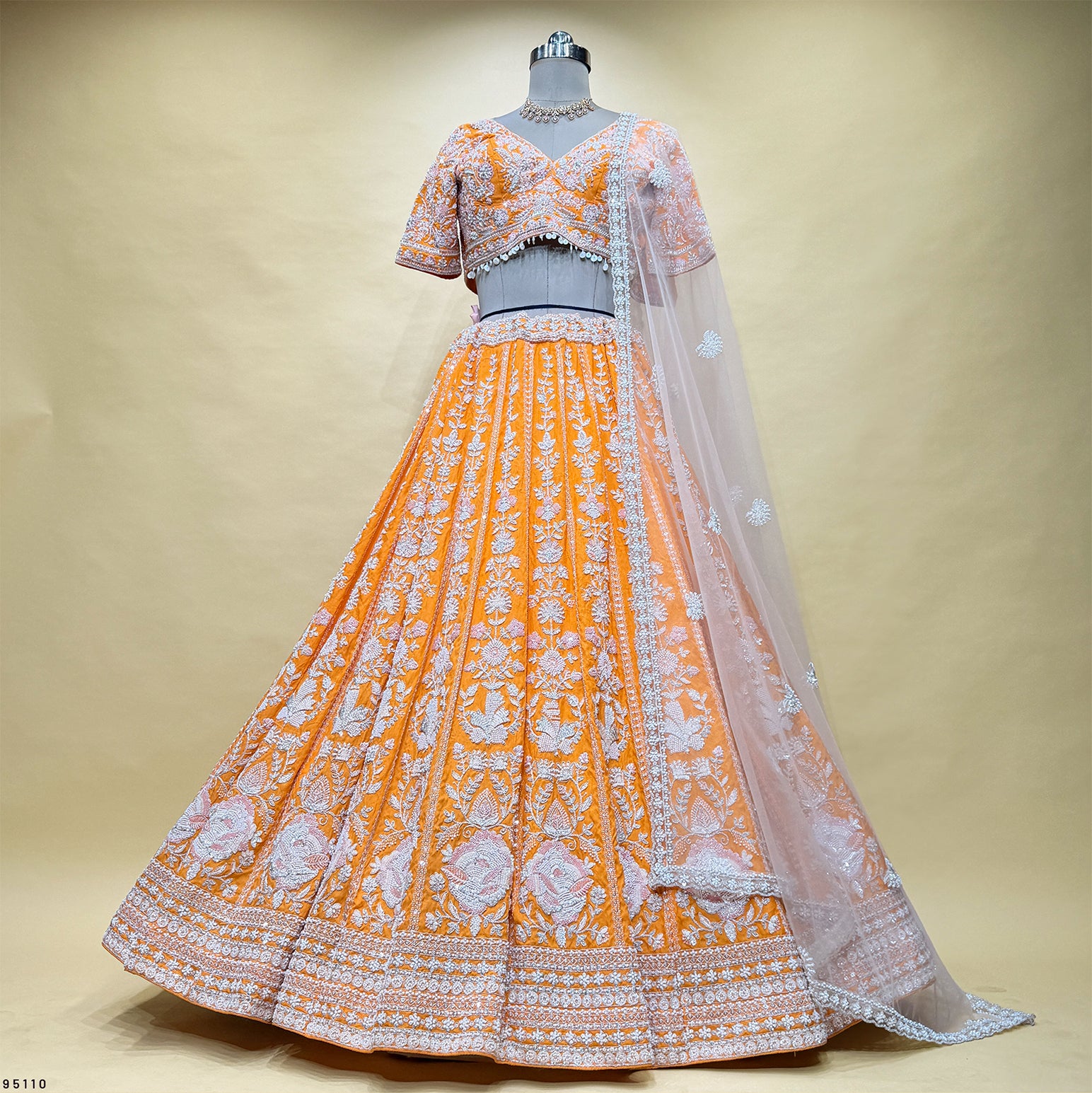 • Lehenga: Flared silhouette in luxurious viscose silk for a fluid, graceful drape