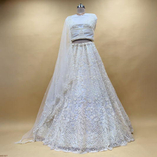 Jazzagals - White Monotone Cutdana Beads Handwork Partywear Lehenga Set