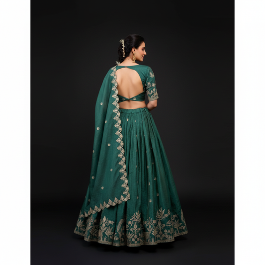 Doli - Gold Crush Sequins and Thread Embroidery Work Teal Lehenga Choli