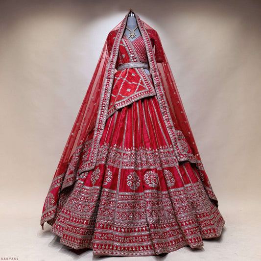 Handwork Royal Red Bridal Lehenga : Double Dupatta Minimal Style Flared Lehenga