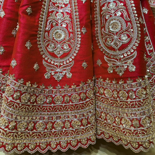 Dulhan in Royal Red Bridal Lehenga : Double Dupatta Raw Silk Flared Lehenga