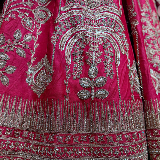 Dulhan in Rani Pink Bridal Lehenga : Double Dupatta Raw Silk Flared Lehenga