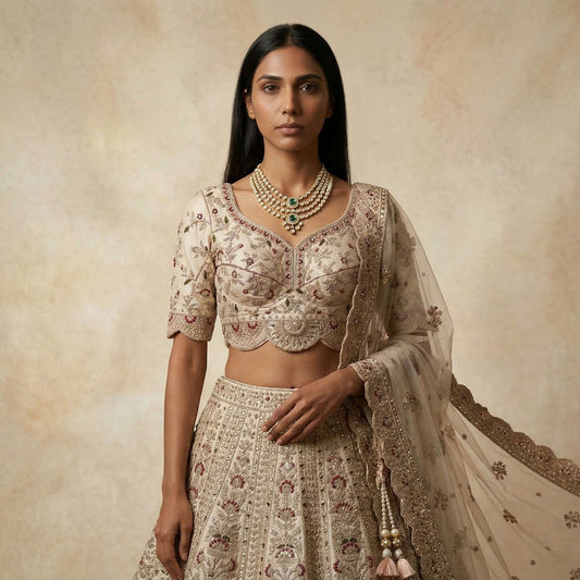 Rosé - Double Dupatta Raw Silk Ivory Bridal Reception Lehenga