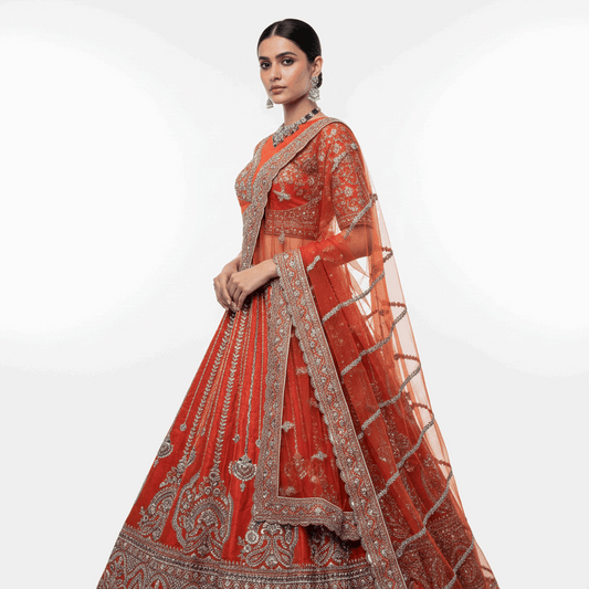 Dulhan in Orange Rust Bridal Lehenga : Double Dupatta Raw Silk Flared Lehenga