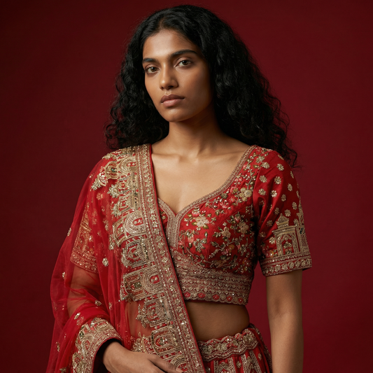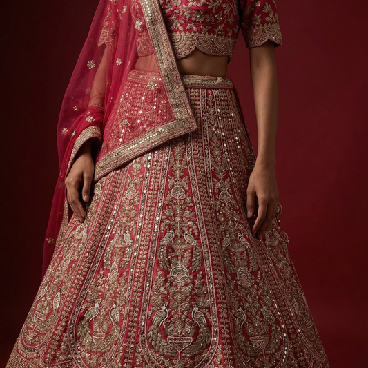 Amrapali - Peacocks Elephants Motif Cutdana Threadwork Red Bridal Lehenga