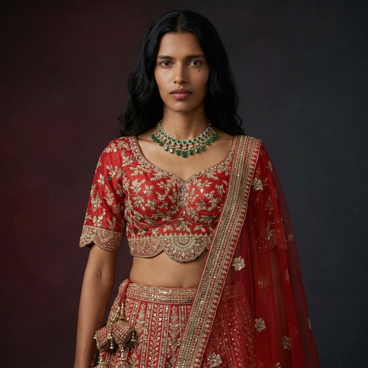 Sangria : Double Dupatta Royal Red Flared Handwork Bridal Lehenga