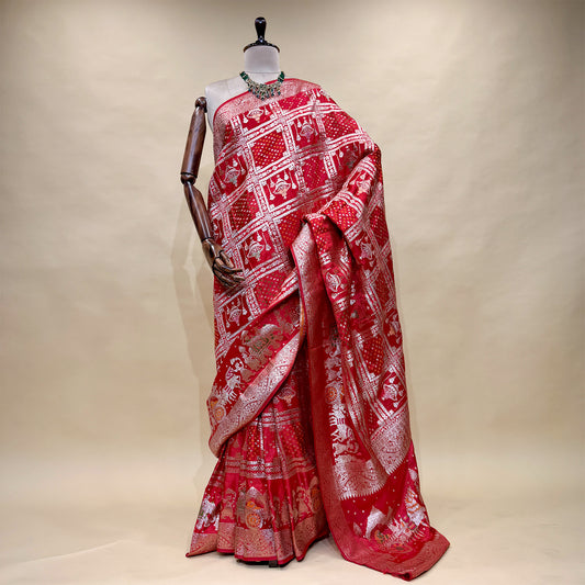 Gharchola Pattern Satin Silk Saree With Zari Border Pallu in Doli Design with Blouse
