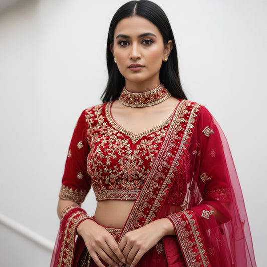 Fast SellingDamsel - Minimal Work Designer Red Velvet Lehenga