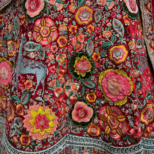 Amrapali - Flowers & Peacock Multi Work Royal Red Bridal Lehenga