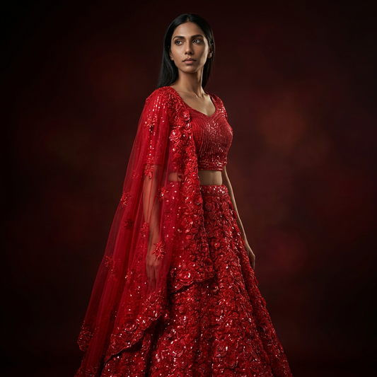 Amrapali - Trending Handcrafted Flared Royal Red Bridal Lehenga