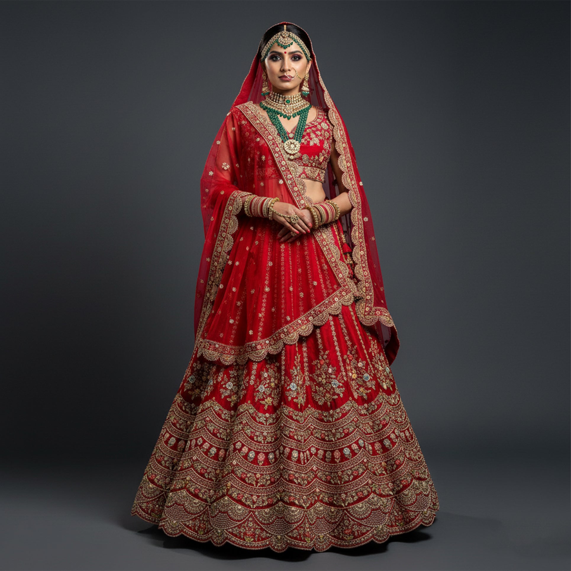 Introducing our latest innovation - the Dulhan in Red Lehenga Elegance from our Celebrity-inspired Royal Baggi Collection. This collection is a perfect fusion of minimalism and grandeur, inspired by the iconic lehenga designs of Indian Film Industry.