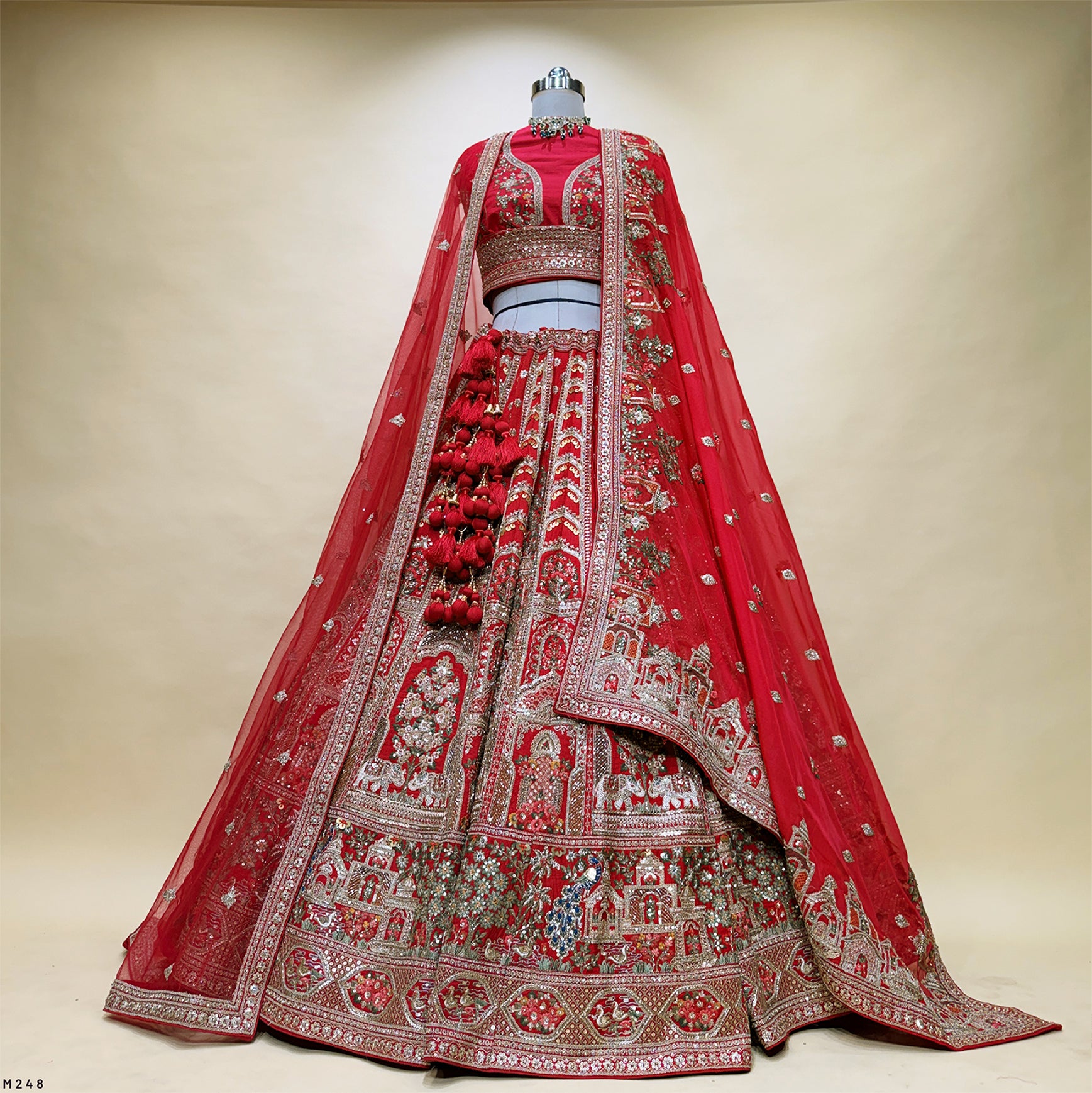 Amrapali - Peacocks Elephants Motif Cutdana Threadwork Red Bridal Lehenga