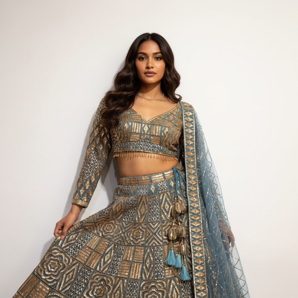 Celestial Collection: Teal Blue Designer Lehenga with Golden Handwork