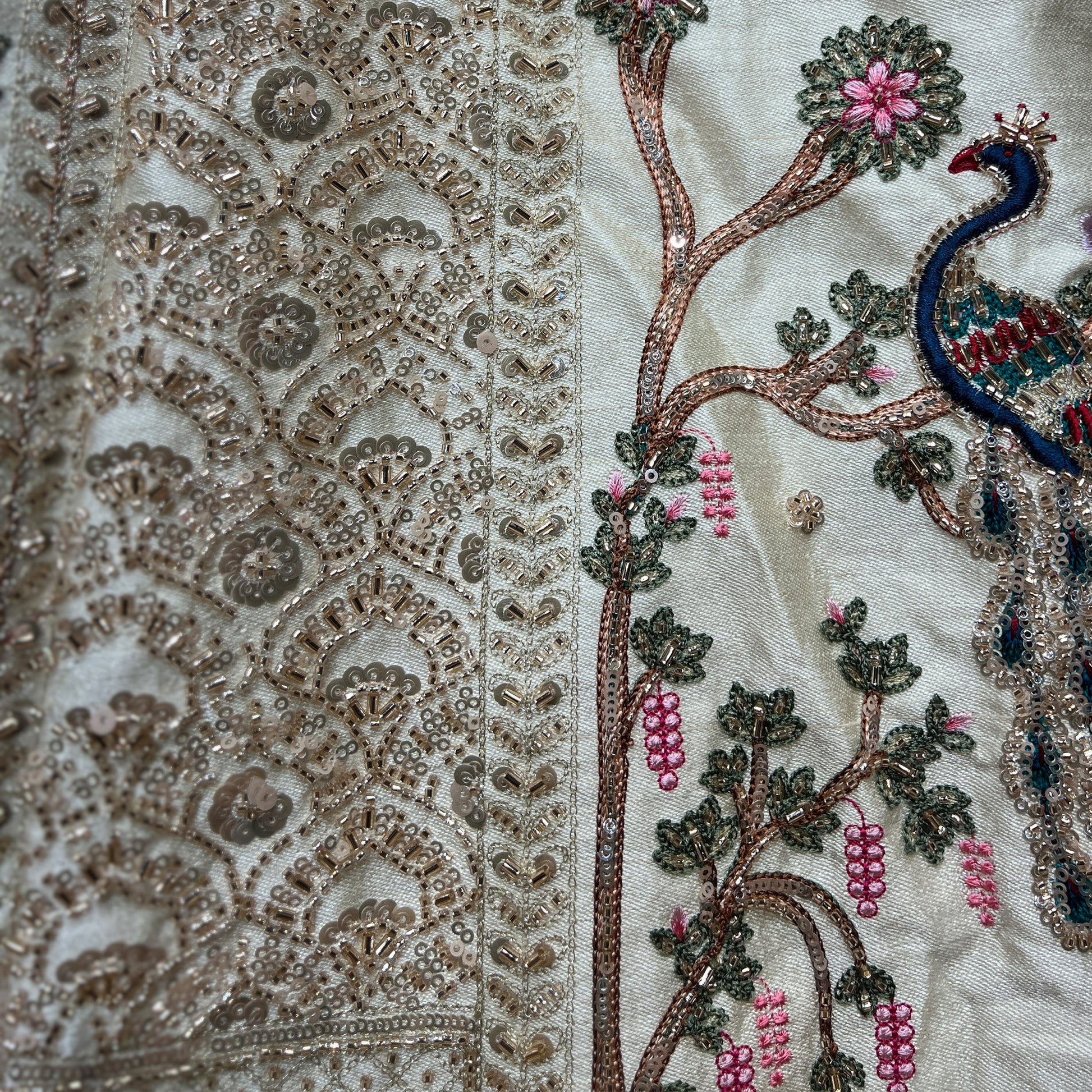 The lehenga features mesmerizing beads handwork and Resham embroidery, making it a true work of art. The heavy double can can and big flair add volume and movement to the lehenga, making it perfect for special occasions like weddings, receptions, sangeet, and parties.