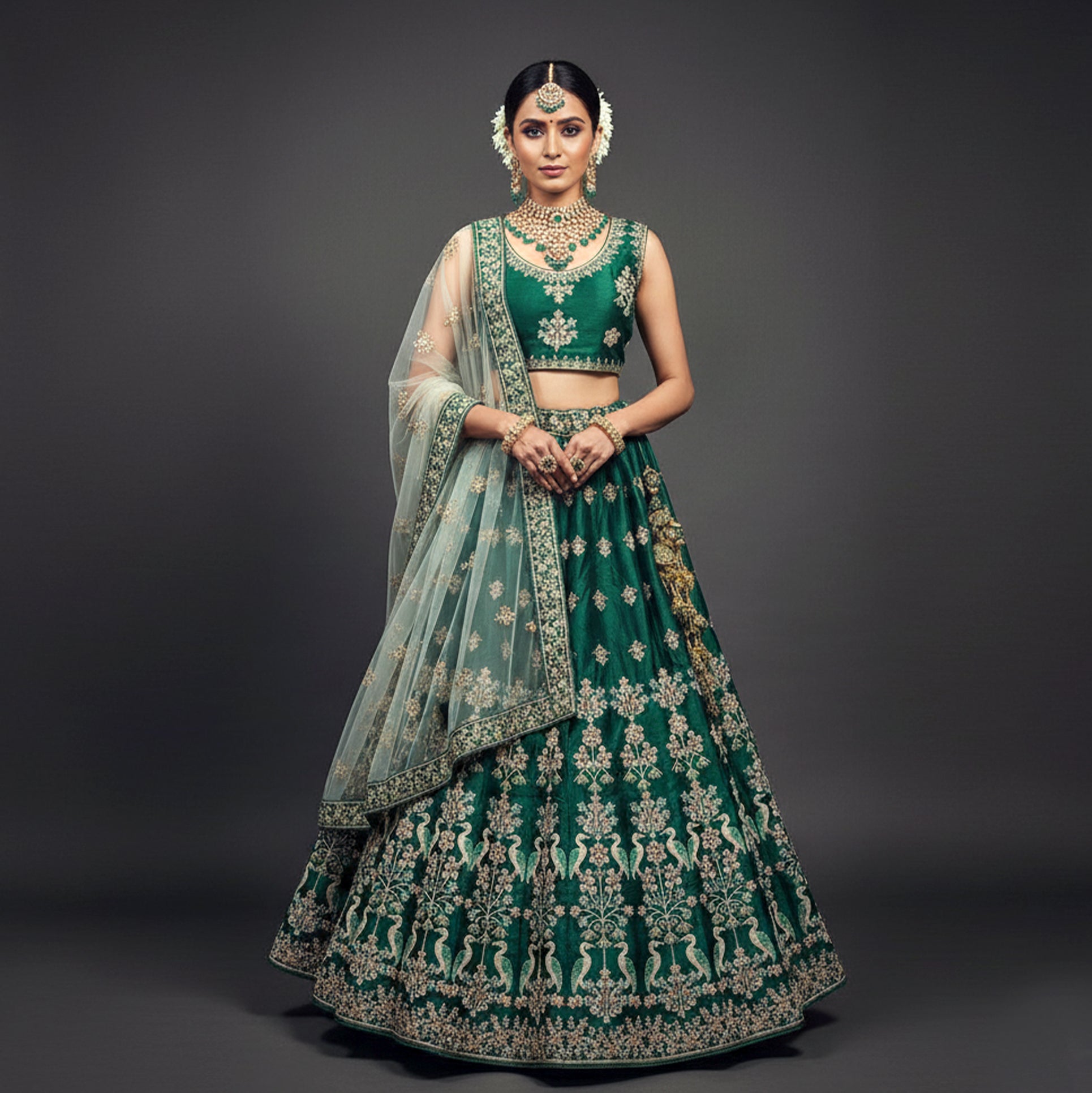 Damsel - Threadwork Deep Green Raw Silk Lehenga