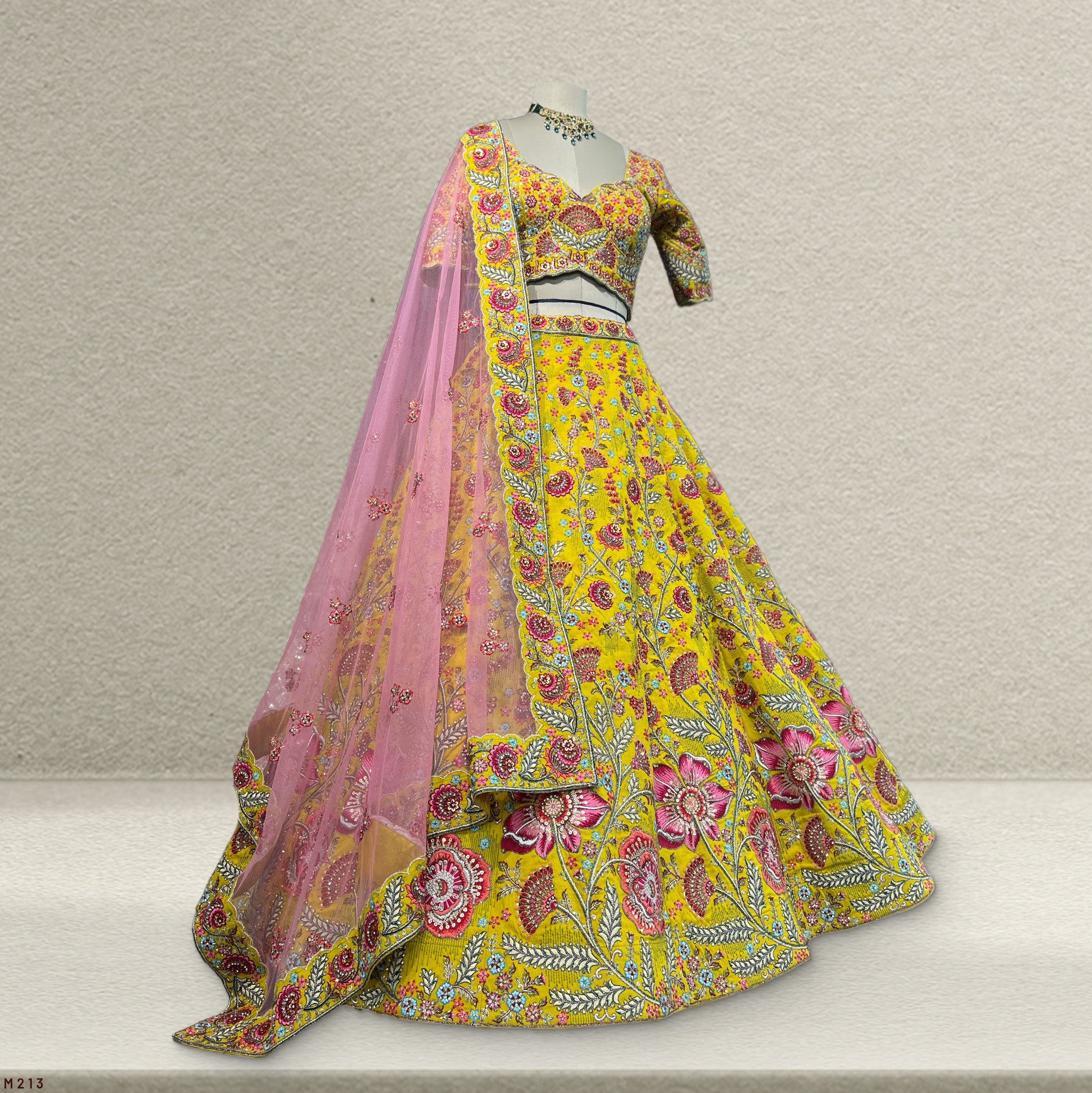 Rosé - Multicolor Raw Silk Mustard Gold Floral Lehenga