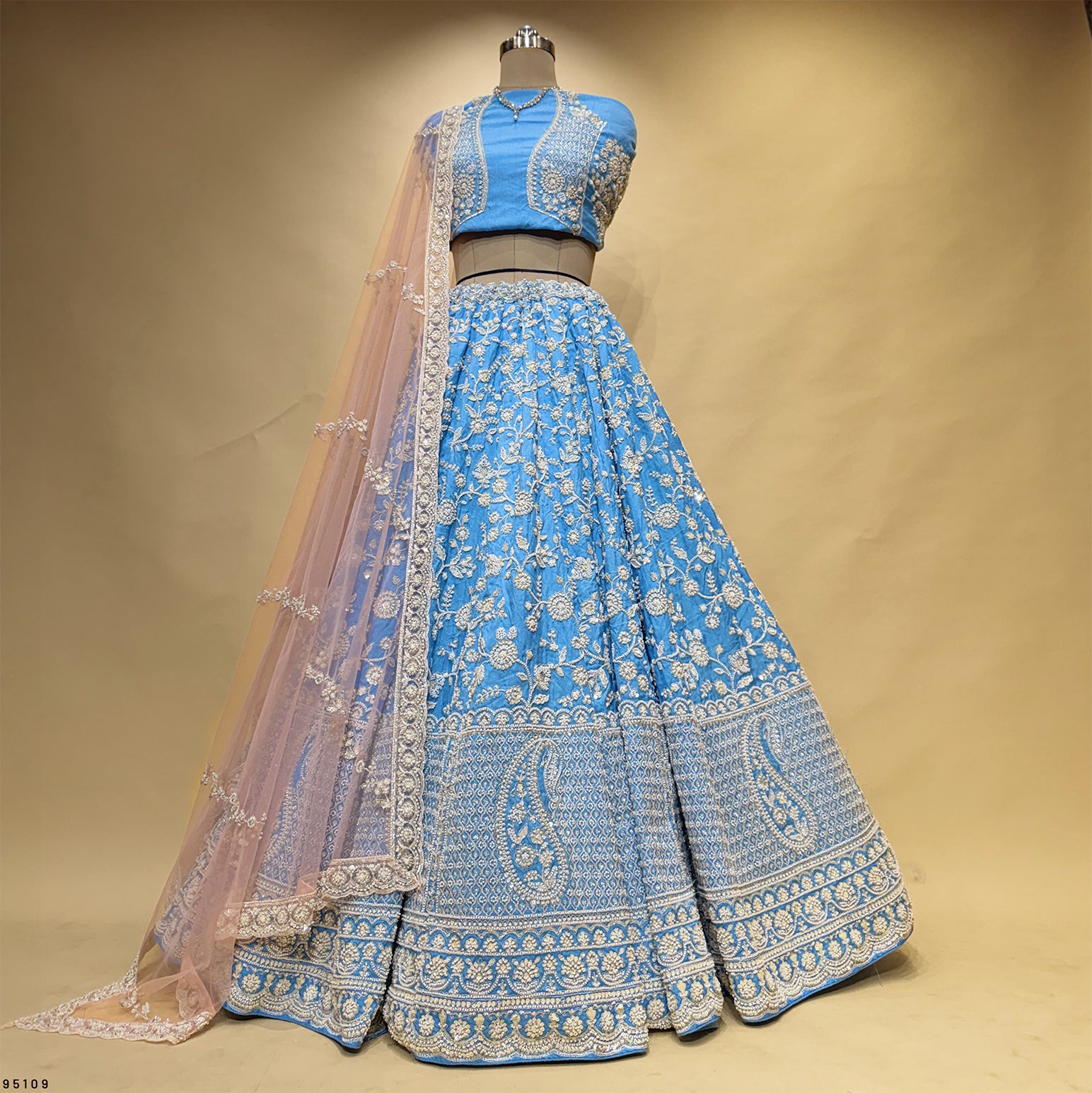 The flared lehenga features intricate pearl and cutdana handwork embroidery, meticulously crafted to catch the light with every movement. The soft viscose silk fabric drapes beautifully while remaining lightweight and easy to carry throughout your event—no heavy, restrictive layers, just pure premium elegance.