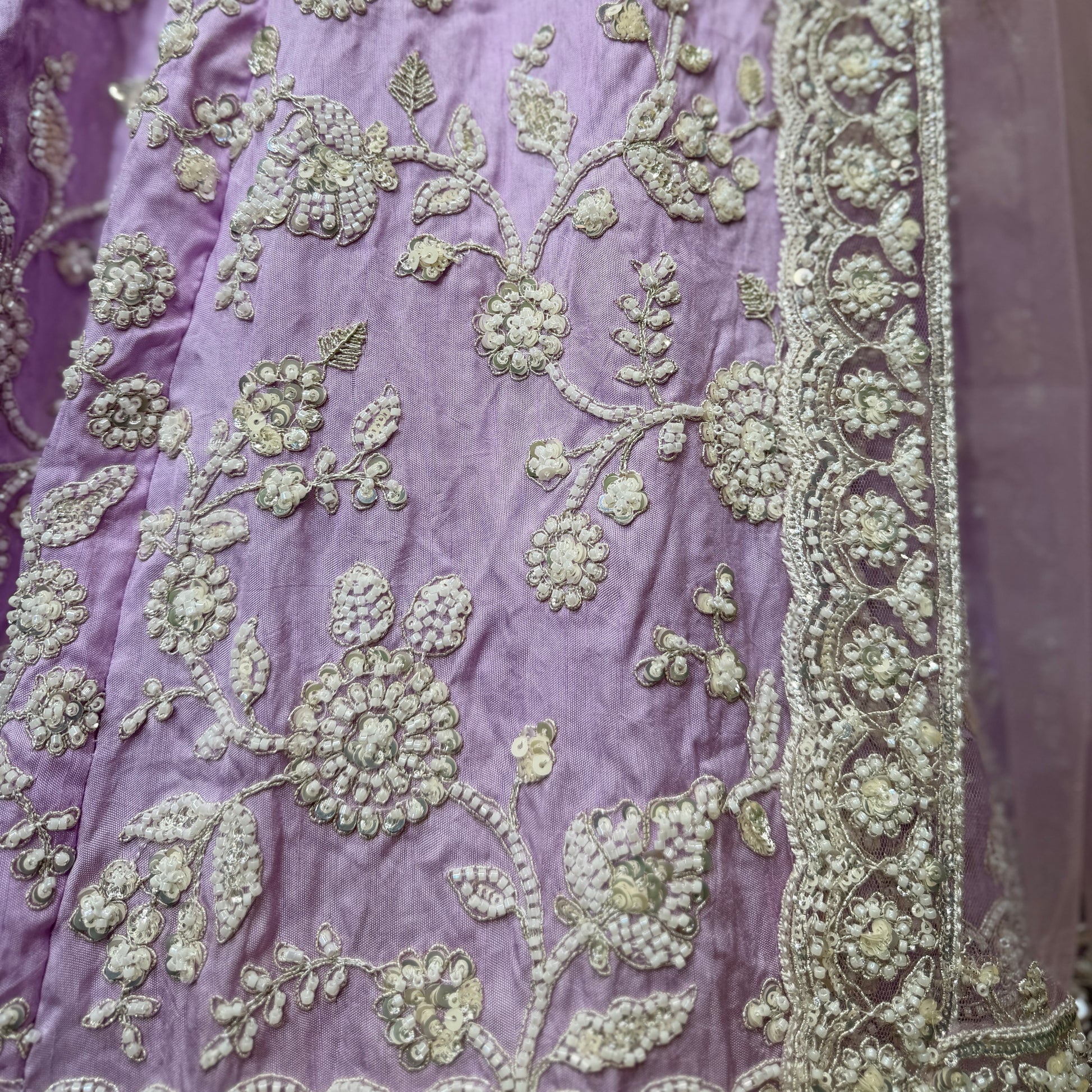 The flared lehenga features intricate pearl and cutdana handwork embroidery, meticulously crafted to catch the light with every movement. The soft viscose silk fabric drapes beautifully while remaining lightweight and easy to carry throughout your event—no heavy, restrictive layers, just pure premium elegance.
