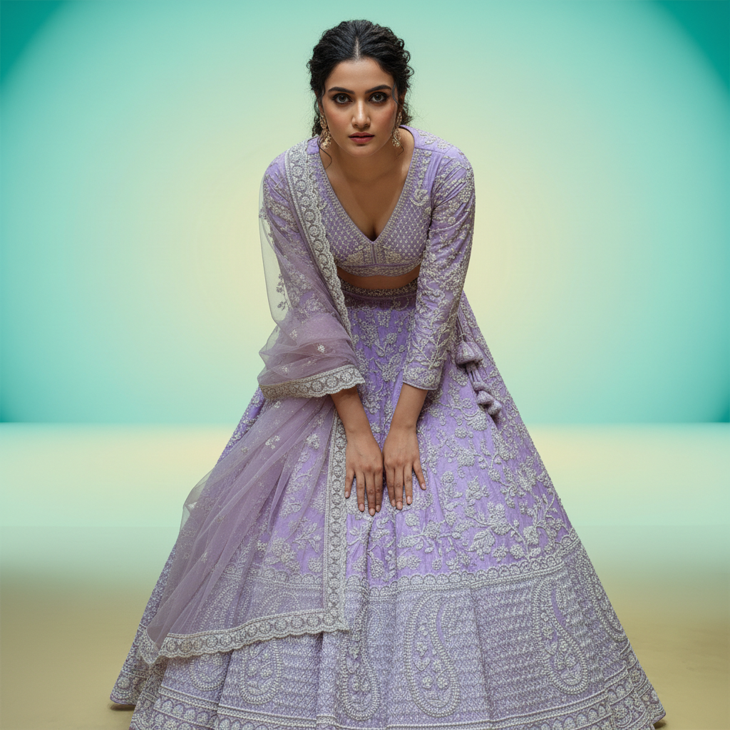 • Lehenga: Flared silhouette in luxurious viscose silk for a fluid, graceful drape