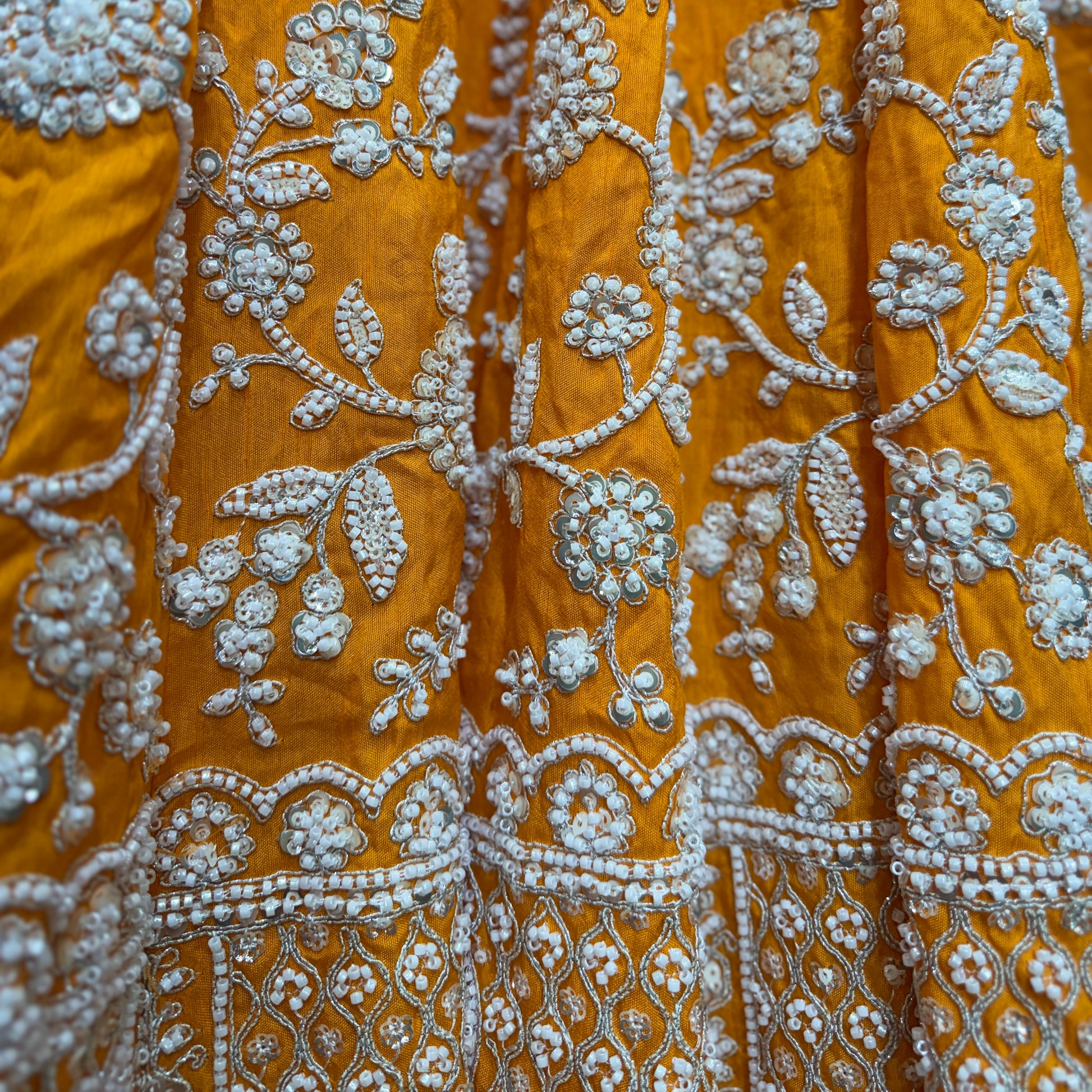 The flared lehenga features intricate pearl and cutdana handwork embroidery, meticulously crafted to catch the light with every movement. The soft viscose silk fabric drapes beautifully while remaining lightweight and easy to carry throughout your event—no heavy, restrictive layers, just pure premium elegance.