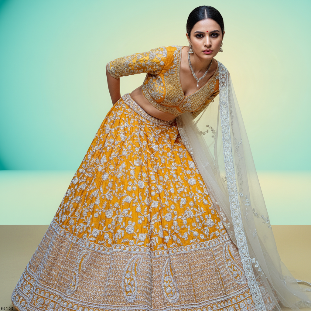 - Lehenga: Flared silhouette in luxurious viscose silk for a fluid, graceful drape